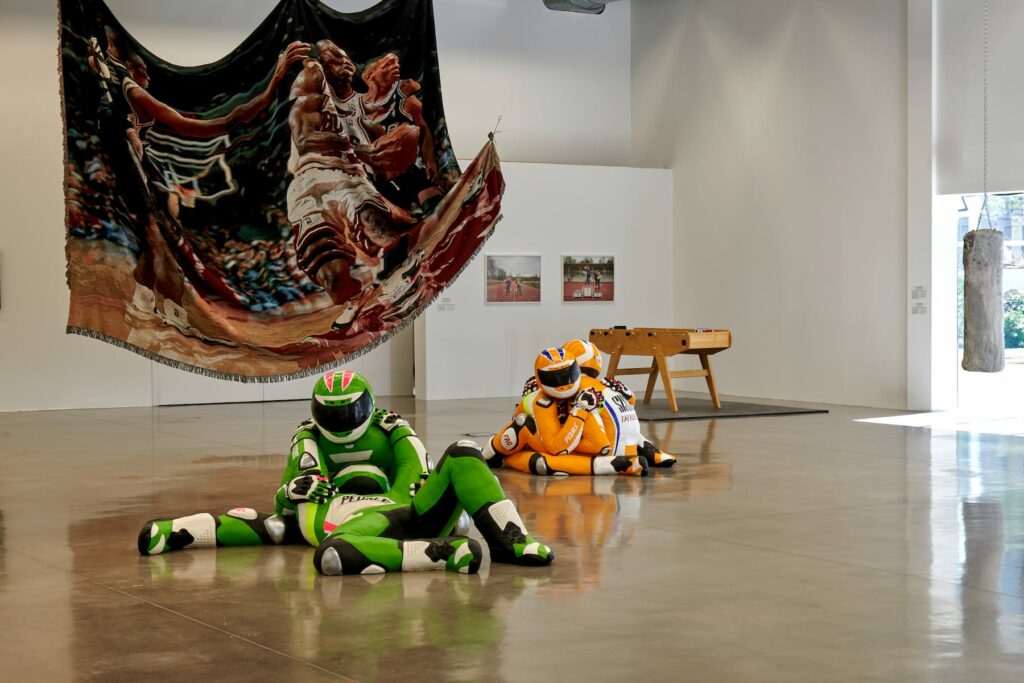 Parmi les 3 volets de la trilogie « Des Exploits des chefs d’œuvre » dont Muriel Enjalran directrice du Frac Sud est à l’origine avec le commissaire Jean Marc Huitorel, les occurrences du Frac et du [mac] se détachent, ce dernier avec son prisme pictural agissant. Au Frac, il est question de la gloire et ses présupposés avec dès l’entrée du parcours l’œuvre in situ de Gérard Deschamps : des structures gonflables qui dessinent un luna park flottant, tandis que Jean Bedez, présent tout au long des chapitres, rejoue le soft power des Jeux de Pékin en 2008 ou le duo Berdaguer & Péjus traduit en notation Laban (danseurs), le geste historique de protestation de Tommie Smith & John Carlos lors des Jeux de Mexico. Un gigantesque cyanotype de la taille exacte d’un filet de tennis de l’artiste Jeremy John Kaplan se veut un hommage à l’une des premières joueuse de tennis afro-américaines, Althea Gibson, alors que la grande tapisserie de Noel W. Anderson s’attaque à la représentation des corps racisés dans l’univers de la NBA. Une dimension politique et engagée qui rejoint un autre enjeu de ce projet ; le parallèle efficient entre la place et visibilité des sportives et des artistes femmes comme le souligne la chercheuse et historienne Marine Nédélec dans le catalogue. Une histoire d’émancipation qui va au-delà des représentations et stéréotypes, notamment dans l’univers de la boxe avec la vidéo de Sarah Trouche Je ne peux pas rester silencieuse, où de jeunes boxeuses se confrontent à des images de domination et de prédation dans la peinture classique, ainsi que le court métrage de Fiona McMonagle The Ring. Si la Fédération de boxe compte à présent 27% de licenciées, il reste du chemin à parcourir… La posture façon discobole de Lea Guldditte Hestelund qui reprend les canons du corps masculin glorieux et viril, ou le babyfoot de Bianca Argimon avec ces joueurs fatigués et perclus de douleur cherchent à dessiner de nouveau symboles et imaginaires, de même avec la performance d’Elina Brotherus et ce podium détourné de ses attributs. Vrai coup de cœur pour l’installation de Johanna Cartier qui détourne les codes du stade et du fan club avec cette imagerie de pacotille liée au footballer/prince charmant, Ce n’est pas forcément un but en soi. La question du genre est aussi abordée de façon directe ou implicite avec les impressionnantes sculptures en céramique de Louka Anargyros, des motards dont les combinaisons sont recouvertes d’insultes homophobes ou la série photographique d’Estelle Hanania du catcheur mexicain Cassandro el Exotico qui n’hésite pas à combattre en travesti. Ces dynamiques d’empowerment irriguent aussi plusieurs propositions du [mac], j’ai voulu revenir avec Muriel Enjalran sur les valeurs véhiculées par le sport dans ces récits individuels et collectifs entre hommage et détournements. Elle a répondu à mes questions.