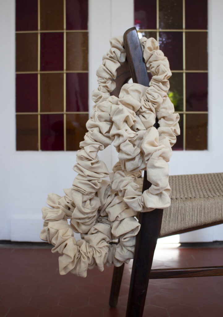 Pendant mes études à Marseille je travaillais à la Friche de l’Escalette dans les Calanques, où j’alternais entre la médiation et la restauration d’œuvres d’autres artistes et designers. Entre l’Escalette et les beaux-arts je travaillais avec la matière constamment. Et même si j’avais une pratique de la sculpture, je ne considérais pas le fait d’être artiste comme le résultat d’un choix. Quelques mois après l’obtention de mon DNSEP je suis parti en Afrique du Sud. J’y ai fait une résidence de céramique pendant un mois. Mais comme j’étais loin de mon environnement quotidien, j’ai eu le temps de réfléchir au sens de mes journées. Etant accueillie chez un membre de ma famille, j’ai pu investir une pièce pour coudre ma première paroi textile. Ca a été le début d’une réflexion encore en cours, dont l’exposition au Salon du Salon fait partie.