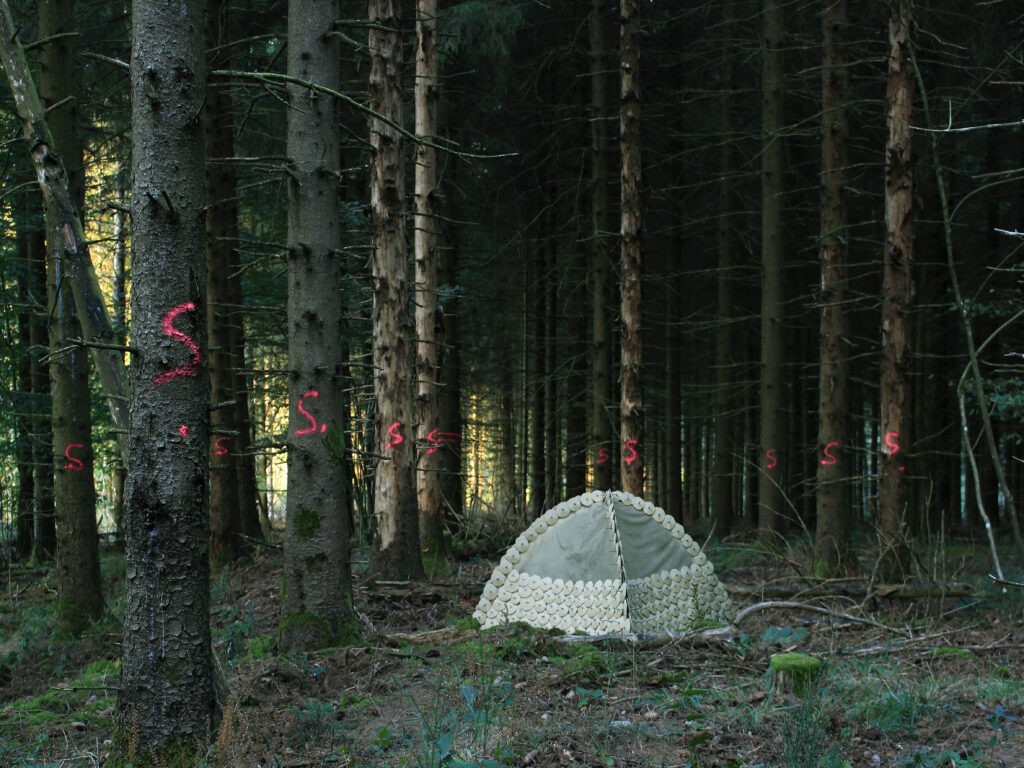 La réalisation d’un Habitat pour d’Autres Espèces, sculpture composée d’éléments en céramique évoquant une tente de camping, s’est incarnée, via un montage photo, au sein d’une zone forestière destinée à subir une coupe rase. Les arbres concernés étant martelés par les bûcherons. J’ai ensuite réalisé un encadrement avec du bois de la même forêt, pour le montage photo imprimé. Le cadre a fait l’objet d’une collaboration avec un menuisier à Revel, dans la Montagne Noire. Une manière de voir ces arbres transformés pour un autre imaginaire que celui de la grande consommation.