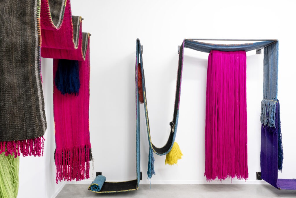 RB. Les questions de la sororité, du domestique, sont déterminantes chez plusieurs artistes comme Elif Uras qui fait appel à des entrepreneuses dans la région de Iznik dépositaires de ce savoir-faire autour de la céramique, ce qui représente une prise de pouvoir par les femmes puisque sous l’Empire Ottoman c’était l’apanage des hommes. Sara Ouhaddou travaille avec des communautés d’artisans dans le grand sud Tunisien autour de techniques de tissage. Chiara Camoni revendique la collaboration autour de savoir-faire avec ces grands colliers de forme abstraites et immédiates qui renvoient à l’arte povera. Nelly Agassi pratique la broderie qu’elle déplace dans l’espace public comme vecteur d’échange. Aysha E Arar questionne la tradition et le rôle imposé aux femmes dans des dessins peuplés de monstres et de chimères.