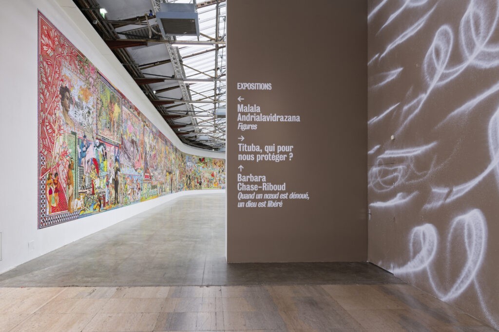 L’artiste franco-malgache investit la grande verrière du Palais de Tokyo le long de ce mur courbe de 60 mètres de long. Ses « Figures » immédiatement reconnaissables, sont réalisés à partir de photomontages numériques issus d’archives iconographiques héritées pour la plupart des 19e et 20e siècles, et qui renvoient aux imageries de la modernité concomitant à la colonisation. Une circulation accélérée des biens et des images, imposée par le capitalisme qui repose sur l’extraction des ressources naturelles et la domination des corps.