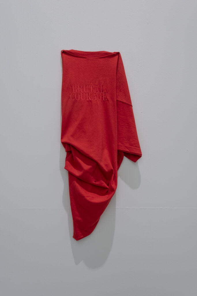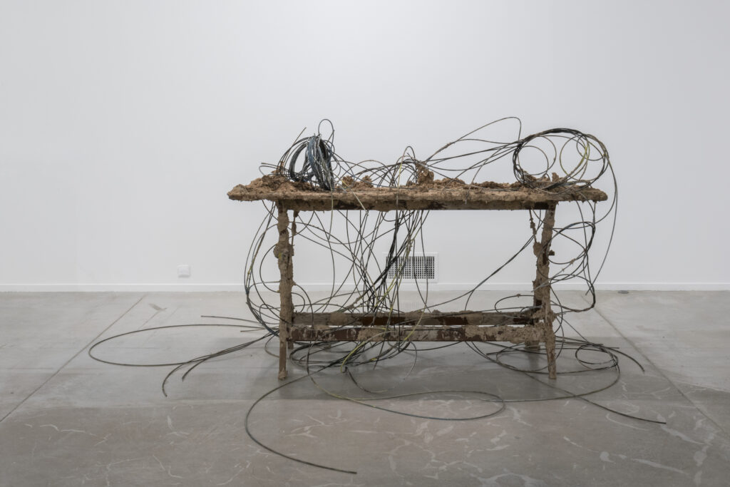 L’exposition de l’artiste français basé à Marseille, Aurélie Potier au MO.CO. Panacée est la révélation de cette saison. Les notions d’impermanence et d’instabilité traversent l’ensemble du parcours. Du mortier qui se désagrège, des plaques d’acier soumises à l’érosion du temps, des câbles qui traversent le bois de meubles ou qui rampent sur les murs, des pics d’acier dont la torsion dessine un langage, un simple T-shirt brodé rejouant les plis de la peinture…une porosité s’installe dans ces interstices fluides et ambigus.