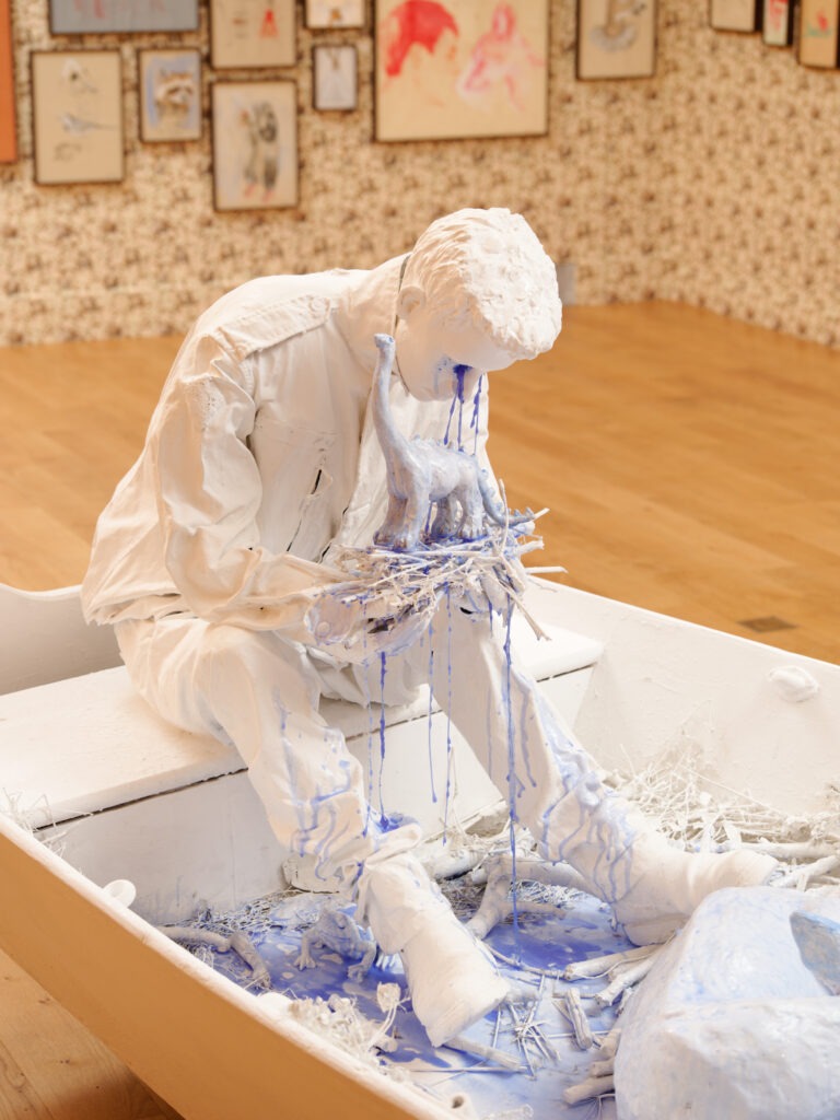 The middle of the room is occupied by a plaster sculpture of a stranded boat where a boy cries into his hands. A blue liquid resembling wax emitting from his eyes falls onto the boat and slowly starts the fill it. A birds nest of twigs rests in his hands where a small dinosaur is perched atop, alongside various animals sat on the boat. The boy’s own tears filling the boat they are occupying suggests that he is perhaps the cause of his own dismay. Such as his future choices contributing to climate change can affect his fellow friends. This idea is accentuated with the presence of an animal, the dinosaur that is now extinct.