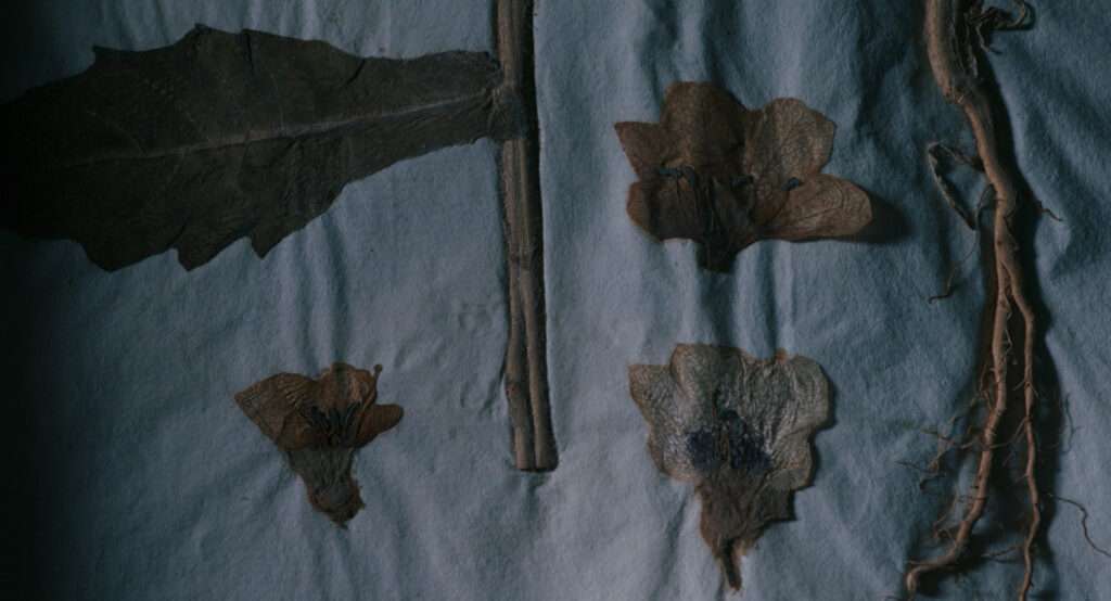 J’essaye de façon générale dans mon travail de relier ce que certaines tendances et héritages culturels persistent, à séparer en catégories distinctes : l’humain et l’autre qu’humain, le corps et l’esprit, le visible et l’invisible. Ce régime de la division permet et légitime toute sorte de dominations et d’aliénations. Il est très destructeur. M’intéresser au règne végétal dans ce film a été un moyen de tenter de reconsidérer nos racines, notre relation à la « nature » et à nous-mêmes en tant que nature. Pneuma fictionnalise l’idée de la plante comme pharmakon : à la fois remède, poison et bouc émissaire. Ceci passe par des outils comme le time-lapse ou la microcinématographie permettant de montrer ce qui est d’ordinaire invisible à l’œil humain, d’animer ce qui nous apparaît inerte (et in extenso exploitable comme simple ressource). L’anthropologue Eduardo Viveiros de Castro écrit dans son livre Métaphysiques cannibales, que « La personne” et la perspectivité” – la capacité doccuper un point de vue – est une question de degré, de contexte et de position, plutôt quune propriété distinctive de telle ou telle espèce. » Il y parle de la manière dont le perspectivisme amérindien peut nous permettre de questionner notre vision occidentale de la nature et des vivants, coincée dans des relations de sujet à objet. Le cinéma a je crois cette capacité de créer des ruptures perceptives, de rendre sensible et raconter les histoires autrement. Je me suis amusée dans le film à faire parler des plantes toxiques, et à conter des cas d’intoxication disruptives.