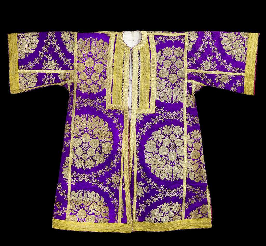 Caftan d’apparat, Rabat, Maroc, fin du XIXe-début du XXe siècle. Filés métalliques, broché de soie, galons dorés. Paris, musée du quai Branly – Jacques Chirac. Photo service de presse. © musée du quai Branly – Jacques Chirac, photo Claude Germain