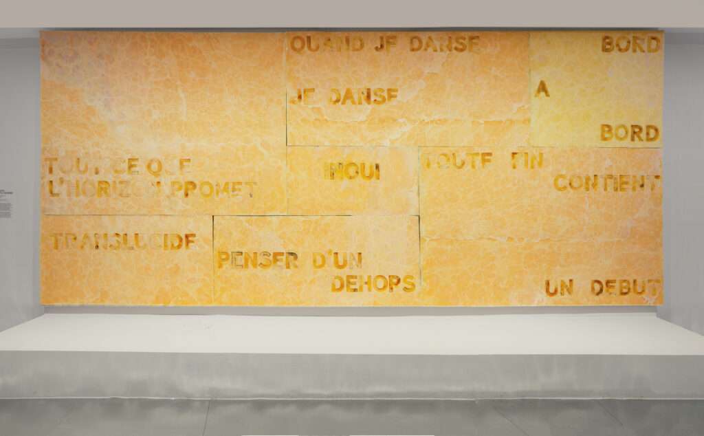 Autre œuvre marquante, Skins Poems de Morgane Tschiember se distingue. Pour créer cette œuvre spécialement conçue pour l’exposition, l’artiste utilise des plaques de mousse polyéther recouvertes de cire, qu’elle fait ensuite craqueler en y apposant différentes parties de son corps. Des phrases inscrites au fer chaud viennent ajouter une dimension de révélation ou de mantra. L’artiste cherche à concevoir une matière vivante et sensuelle, évitant le froid d’une toile ou la rigidité d’un bloc de marbre. Son travail est hybride, refusant de se limiter à un support unique.