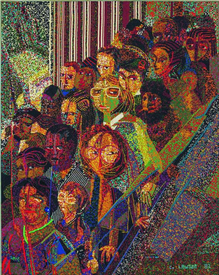 Clem Lawson, Angoisse sur l’escalator, 1983 Perles de verre sur bois, 92 × 73 cm