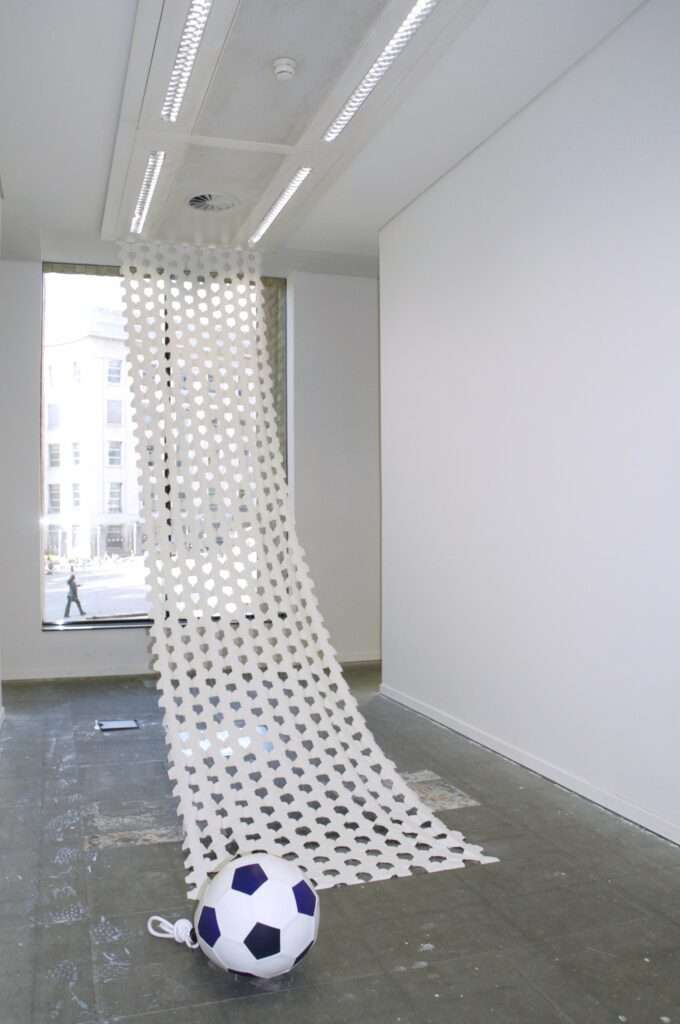 J’aime proposer de grandes installations. Au début je créais des objets que j’utilisais dans des vidéos. C’est la première fois que je réalise une série de pièces en cuir. Elle fait partie d’une plus grande série de travaux qui s’intitule MEDI-TERRENO. Je l’ai commencée avec un film lorsque j’étais aux Beaux-arts qui traite du monde du football, des rapports au territoire. Mon travail s’articule autour de la question : comment les hommes définissent le territoire. Le monde du football m’intéresse particulièrement à cet endroit. « Medi-Terreno » pointe en même temps le milieu du terrain comme lieu de rencontre et d’échange entre deux équipes avec tout ce que cela peut impliquer de transactions économiques, financières, géo-politiques, mais aussi « méditerranée » comme plus grand espace d’échange pour notre civilisation. Mon premier film était focalisé sur l’espace sacralisé de la pelouse, je l’avais réalisé au Stade Roi Baudoin que j’avais pu investir pendant 6 mois,lors des phases de confinement, il était alors vidé de son activité. On se trouvait aussi dans le paysage, un rapport dans lequel mes pièces viennent s’ancrer. Ce sont des objets que j’imagine toujours comme inclus dans un paysage. C’est le cas ici avec les ballons. Je voulais repartir sur de la sculpture en volume et en même temps travailler le cuir. Ces pièces s’articulent autour du titre de la série « milieu de terrain » et « méditerranée » et j’y investis le motif standard du ballon qui est une image, un symbole emblématique, en l’incluant dans une narration fictionnelle autour d’objets maritimes.