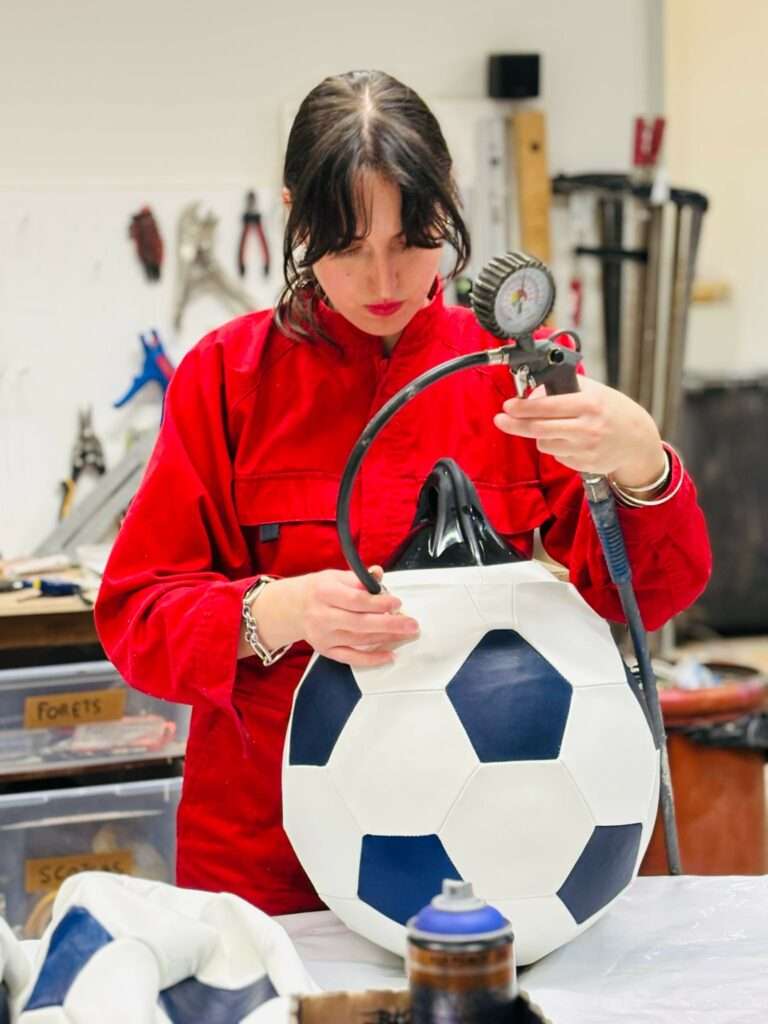Finaliste au Festival de Hyères 2022, (Grand Prix première vision) autour de la marque franco-brésilienne Mipinta, Alizée Loubet réoriente sa pratique artistique et intègre Williewillie studio, résidents au sein de Reset Atelier après une formation à la Cambre et aux Beaux-arts de Bruxelles. Je la rencontre à l’occasion de l’exposition collective Somehow we manage (WillieWillie studio) qu’elle partage avec 15 artistes dont Aline Bouvy et Deborah Bowmann. Alizée souligne l’opportunité offerte par l’atelier autour d’une mutualisation des pratiques et des savoir-faire partagés et le rôle de Bruxelles dans son parcours. Elle revient sur ce qui l’anime autour des territoires de pouvoir et de l’univers du football à partir d’une pratique entre sculpture, installation et textile. Dans ce bâtiment de l’élégant quartier de la cathédrale également occupé par des traders et des fonctionnaires, le collectif apporte une autre réponse au capitalisme ambiant. Alizée a répondu à mes questions.