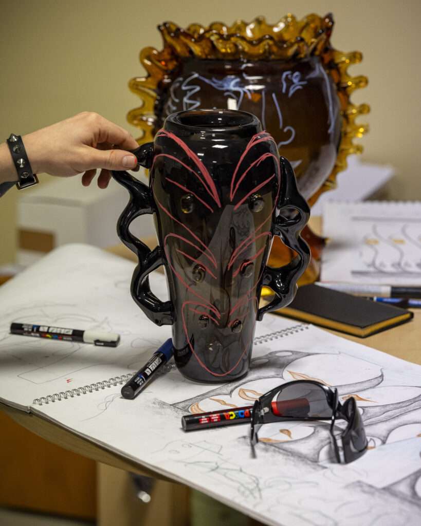 EL. Ce qui en ressort avant tout, c’est l’excellence des artisans de la Cristallerie. Cette maîtrise permet à Jacopo de renouveler la vision de l’ornement, en l’abordant de manière contemporaine tout en proposant une relecture de l’histoire. Notre complicité est ancienne, et sa toute première peinture pour une exposition que j’ai organisée, il y a cinq ans, avait déjà pour support le verre. Il m’a semblé évident de l’inviter, puisque la résidence lui a permis de prolonger ce lien avec le médium, de sortir le verre de la peinture, tout en valorisant les savoir-faire exceptionnels du cristal. Il en résulte un mariage parfait, entre une matière, l’excellence d’un savoir-faire, et une vision.