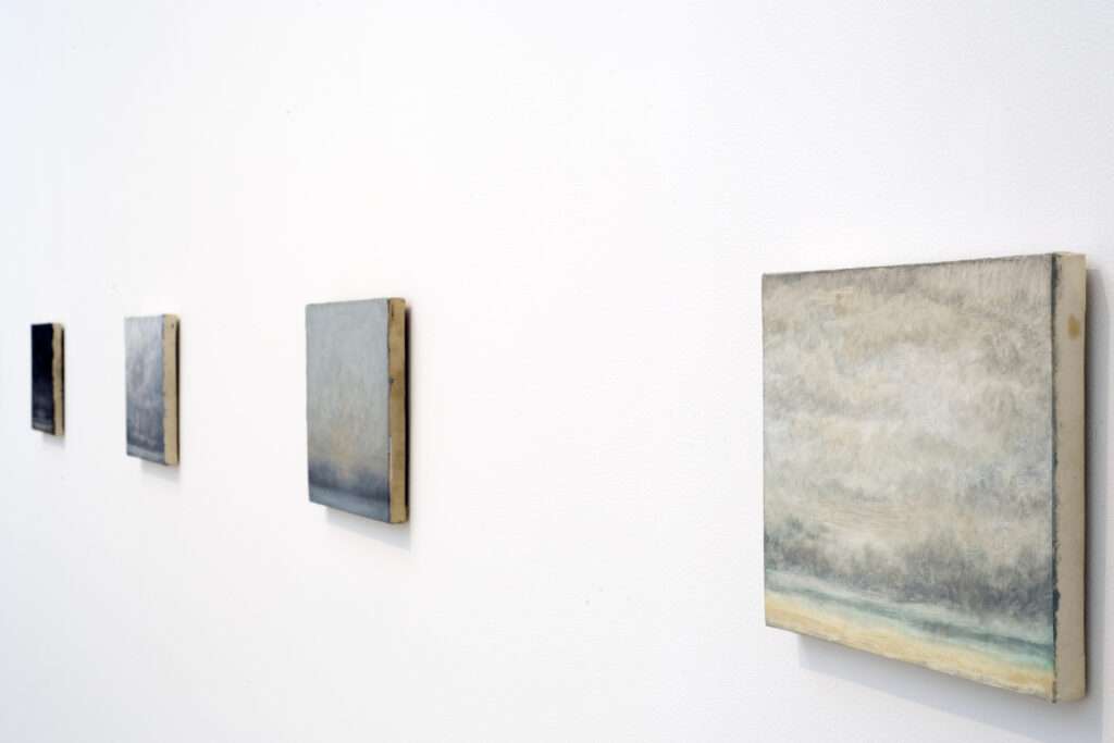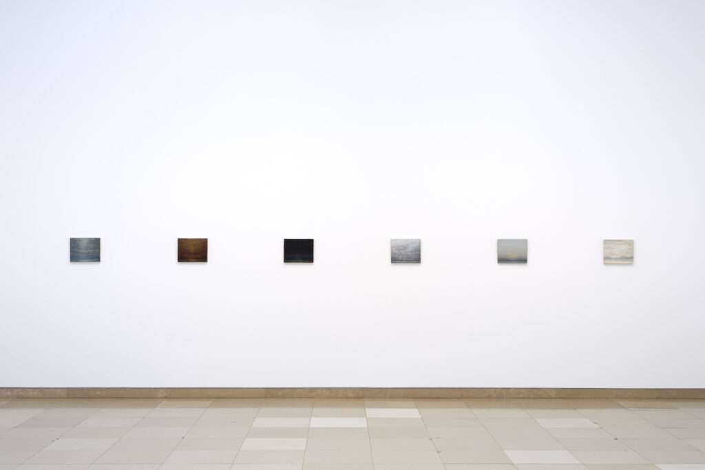 JMP. Ce qui m’intéressait était cette force de peinture dans des petits formats comme cela apparait dès le début du parcours. Nous avons beaucoup discuté sur cette ligne d’horizon de la 1èresalle. On a d’abord une vue d’ensemble mais lorsque l’on s’approche de chaque tableau, on rentre dans chaque paysage. La 2ème partie de l’exposition bien que liée à la première, l’on tend vers une certaine épure et ce travail sur la lumière. Nous avons fait le choix de présenter les grands monochromes qui font partie du travail même si l’artiste en réalise moins. Les lignes d’horizon sont à la limite de la visibilité, l’on passe presque dans l’abstraction jusqu’à aller vers ce que qualifie l’artiste « d’idéogramme de paysage » une installation composée d’un carré de lumière projeté au-dessus d’un carré peint sur le mur. Nous sommes presque face à un paysage conceptuel idéal avec la ligne d’horizon, terre en bas, le ciel en haut.