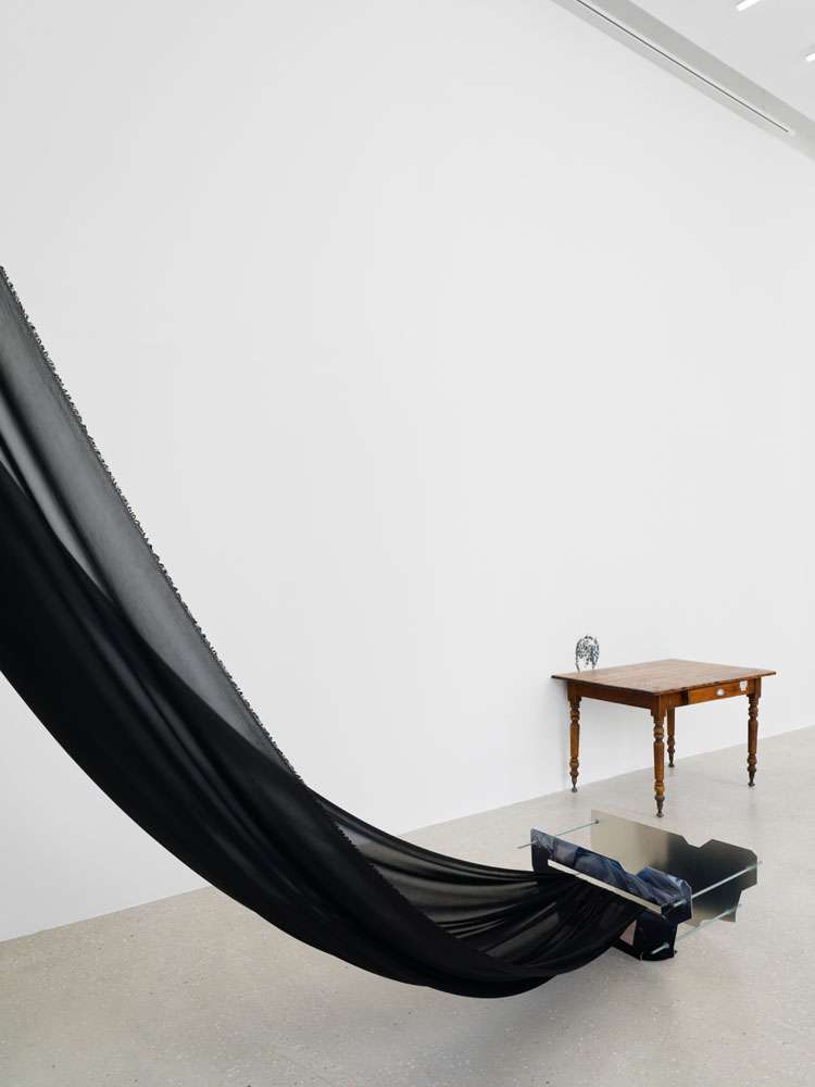 En effet, ces deux artistes explorent entre autres l’internalisation des discriminations raciales dans un contexte occidental et sa transmission à travers la parentalité. D’origine afro-américain, Cudelice Brazelton IV fait référence à la figure maternelle à travers le métier de coiffeuse que sa mère exerce. Le wall-tattoo réalisé à partir d’un morceau de jean brûlé figure un visage d’enfant à la coupe stylisée, comme une empreinte à la fois intime et commerciale rappelant la clarté graphique d’un logo. En tant qu’enfant soumis aux injonctions d’une mère à être toujours « présentable », il pose la question de la transmission des normes et de l’apparence fixés par une société habitée par un racisme latent. En contrepoint, se trouve une caisse en aluminium posée au sol sur laquelle a été imprimée la photo d’un sac utilisé par sa mère, réunissant les outils de coiffure pour ses tutoriels. Elle accueille un grand morceau de crêpe noire, dont j’ai parlé au début de notre entretien, forme énigmatique entre voile de marié, chevelure déployée et ombre mortuaire.