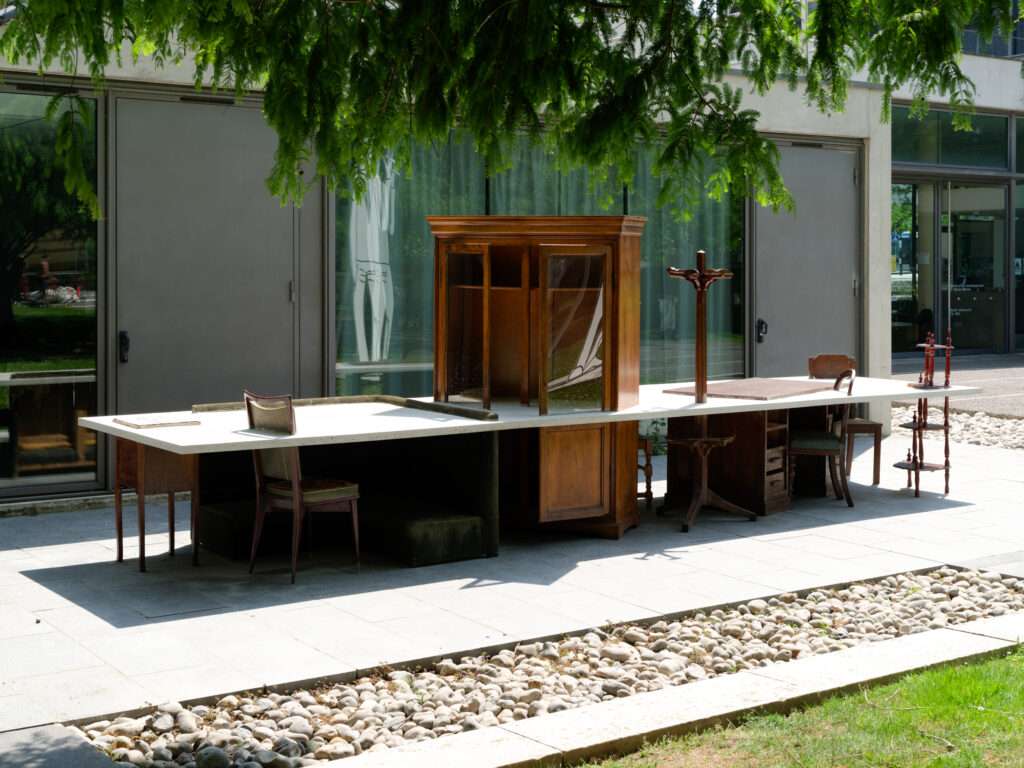 L’œuvre en extérieur de Raphaël Maman est une nouvelle version d’une série intitulée « le Banquet ». Il s’agit comme toujours chez l’artiste d’interroger les normes à l’aune des corps et des usages. Le mobilier et la table dont l’utilisation sont contrariées, appellent à nous interroger sur les normes qui nous entourent ; comment elles entravent nos cops et comment on peut inventer d’autres scénarios, d’autres manières d’occuper le réel en dehors des normes. L’œuvre résonne très particulièrement avec l’architecture du musée puisque Jacques Ripault était un disciple de Le Corbusier qui a pensé l’architecture contemporaine à l’aune de l’échelle humaine tout en libérant et enfermant à la fois le corps. Un dialogue très subtil se créé avec l’histoire du lieu. Cela résonne avec une autre œuvre de la collection qui est dans le jardin « La concentration des services » de Julien Berthier qui questionne le monopole et la rationalisation du mobilier urbain dans une œuvre à 3 dimensions qui concentre en un seul objet plusieurs services de la ville : un abribus, une boîte postale, une caméra de surveillance, une horloge, un haut-parleur…