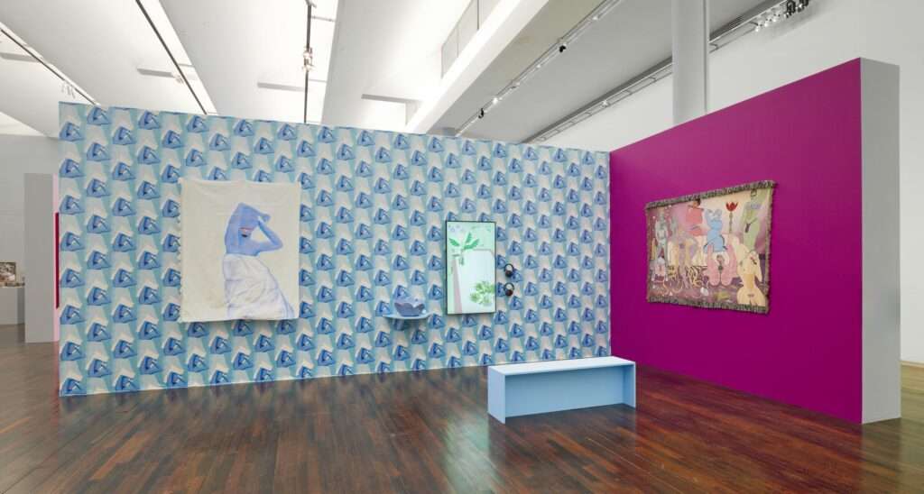 L’installation réunit en même temps une peinture, une tenture murale, une tapisserie et explore la dimension de surcharge décorative selon la démarche de l’artiste, la question du motif, du bon goût, dans une approche très intime. Si l’on prend par exemple la peinture réalisée à partir d’un drap de sa famille, il s’en empare pour y peindre le portrait de son amant endormi. Il se dégage une grande douceur. Ricard fait partie de cette génération qui a grandi avec internet, instagram, les filtres et les Kardashian, l’hypersexualisation des cops et qui s’interroge en tant que jeune personne homosexuelle sur la place de ces réseaux dans sa construction mais aussi celle de chacun et chacune. Il nous délivre également des vidéos inspirées des réseaux et des conseils de vie en mode ASMR où il se transforme en coach de vie pour nous accompagner et nous envoyer comme message que nous sommes tous et toutes fabuleux.euses et qu’il faut croire en soi…la réponse résidant en chacun d’entre nous.