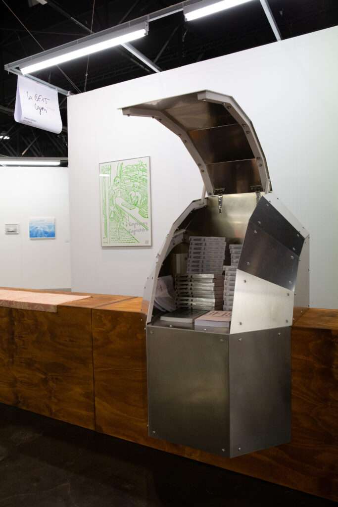 A l’occasion des 30 ans de la BF 15, lieu d’exposition emblématique à Lyon, Jérôme Pantalacci, directeur d’art-o-rama, invite Perrine Lacroix et l’équipe du centre d’art. Le projet intitulé « hôtes, husz, haunt » rejoint la notion d’hospitalité à partir d’une relecture du marché des bouquinistes, proche du centre d’art et ces caisses en inox dont le style moderniste renvoie au patrimoine culturel de Lyon en lien avec les métiers du livre et de l’imprimerie. Si cette déclinaison miniature et outil conçu par le duo Blankett (Rodrique de Ferluc et Juliette George) dont l’hybridation – stockage, transport, commerce – rejoue l’économie d’un centre d’art selon Perrine Lacroix, l’artiste Juliette George également présente au showroom, a reçu le Prix Région Sud 2025 ! Une belle reconnaissance. Perrine Lacroix dresse un bilan et se félicite des liens crés entre son engagement d’artiste et son rôle de commissaire. Elle a répondu à mes questions.