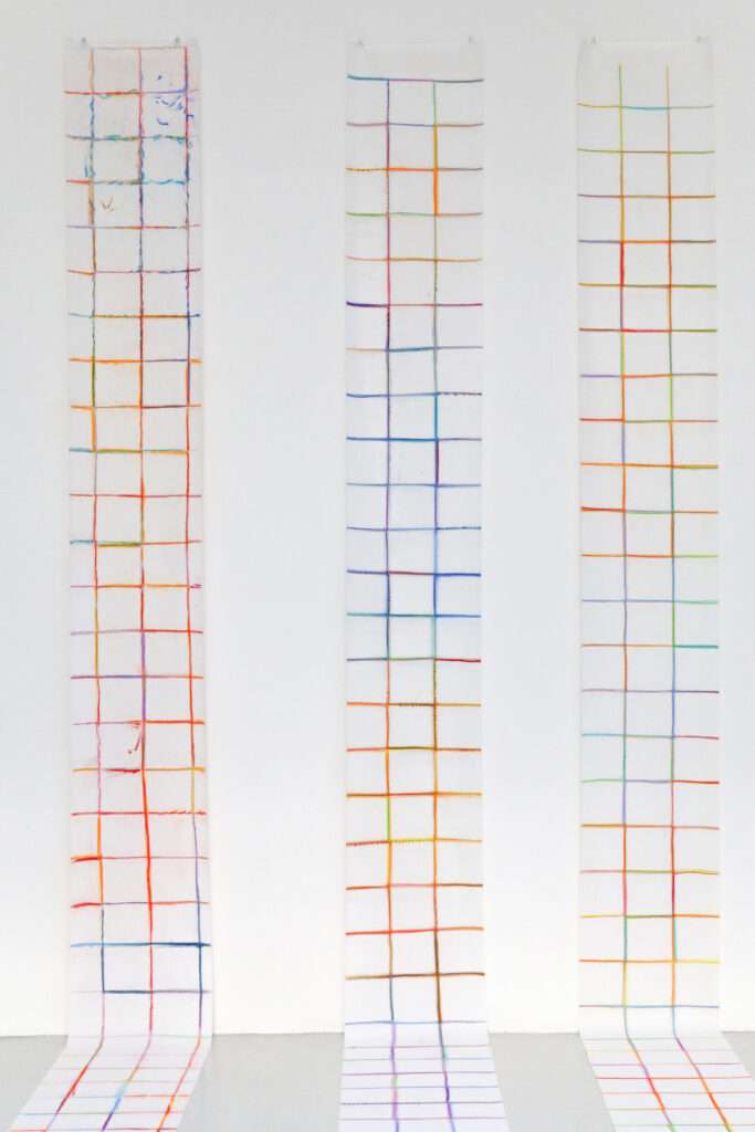 Avec Jacqueline Masmaeker les Couloirs, série de dessins sur rouleaux de papier, il s’agit de jouer sur le quadrillage du couloir de son appartement-atelier, espace essentiel. Minimaliste, insaisissable, visible et invisible, sa démarche est ancrée dans la pratique du dessin. Guillaume Desanges alors commissaire de la Verrière Hermès l’avait magistralement révélée au public.