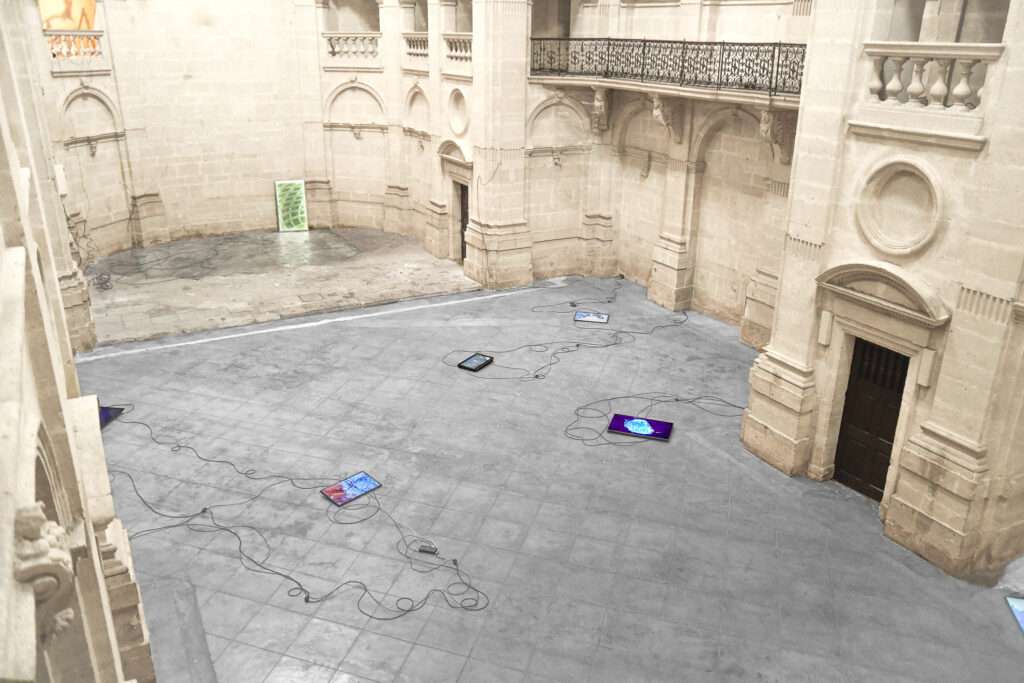 L’installation qui se veut immersive, reste adaptable selon le contexte d’exposition allant de 7 écrans d’origine pour Nîmes à 5 pour Romainville avec ces très nombreux câbles qui dessinent sur le sol des sortes de rhizomes, de réseaux qui connectent l’installation au lieu mais aussi au public.