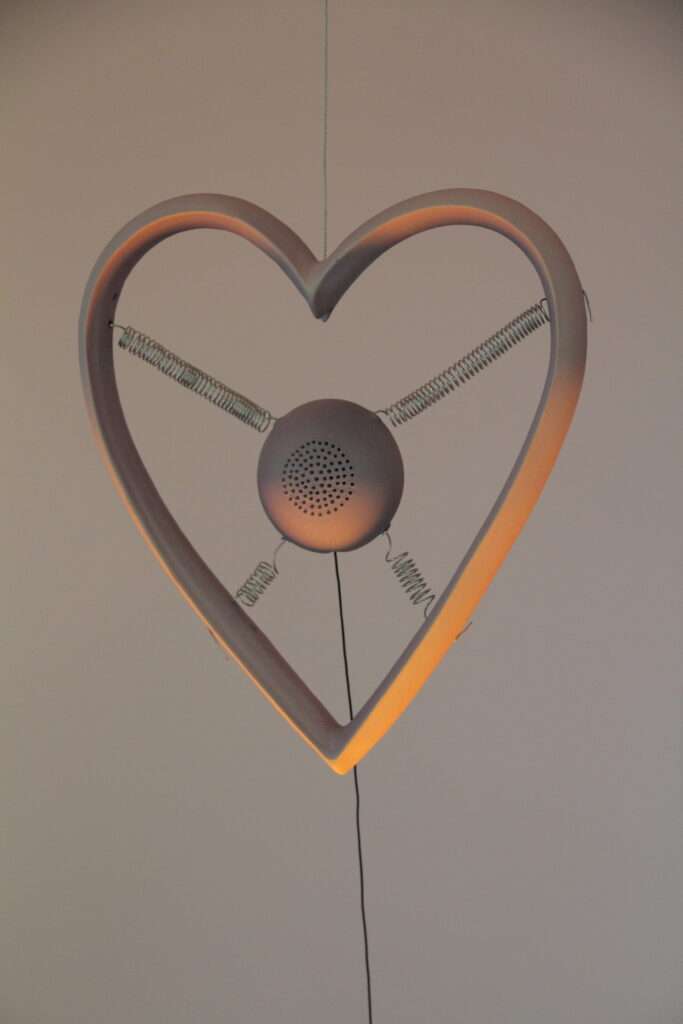 L’entrée dans la première salle de l’exposition du côté de la Fondation Fiminco a été pensée par les curateur.ices : Salomé Fau, Alexis Hardy et Temitayo Olalekan comme une arrivée dans un souterrain, où on peut voir le travail de Alix Nguyen, Xianne Han, et le mien. La pièce est plongée dans la pénombre, dans laquelle apparaissent des formes et des images. Les résonnances que j’ai pu observer sont dans le rapport a là lumière et la fiction. Nous avons tous.tes les trois détournés des objets de leur fonction pour reproduire des sculptures où la fiction opère, que ce soit des rats qui cherchent dans une poubelle (Xianne Han) une bouche d’aération lumineuse (Alix Nguyen) ou un microphone en forme de cœur en céramique. Je vois des affinités dans les matériaux utilisés, la céramique, et le rapport à la lumière.