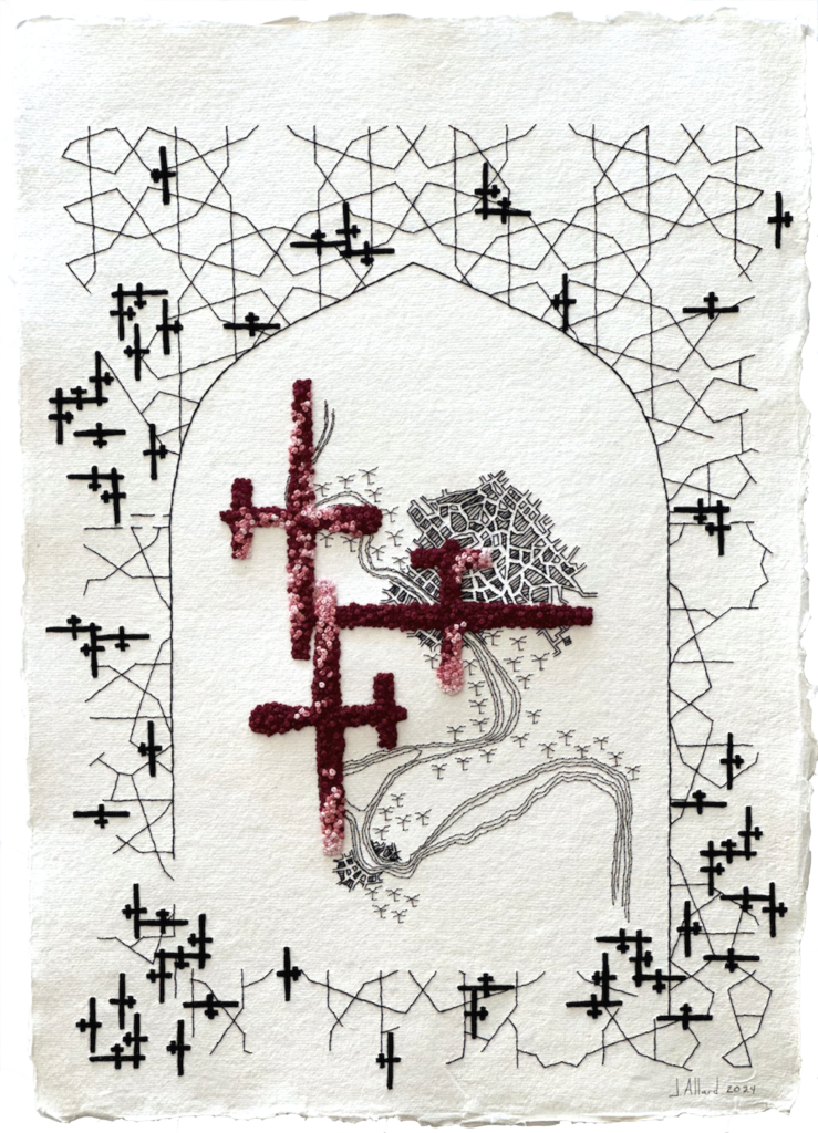Johanne Allard, Circling Drones (Iraq), 2025, broderie à la main sur papier coton 320 g, 43×31 cm, édition 3/3 Courtesy de l’artiste et No/mad utopia