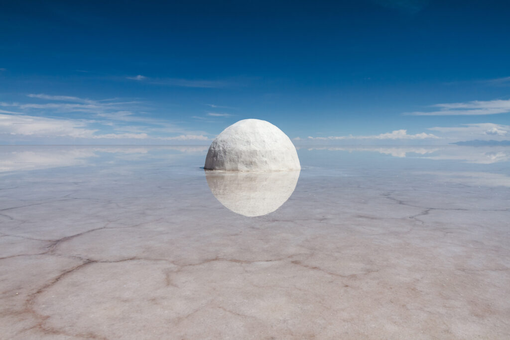 La survenue presque miraculeuse de pluies a alors métamorphosé le désert en un miroir monumental, révélant une sphère semblant flotter en apesanteur. Cette planète imaginaire, baptisée Elina par l’artiste, apparaît comme un monde éphémère, voué à disparaître. Elle constitue le cœur de l’installation, à la fois visionnaire et mélancolique.
