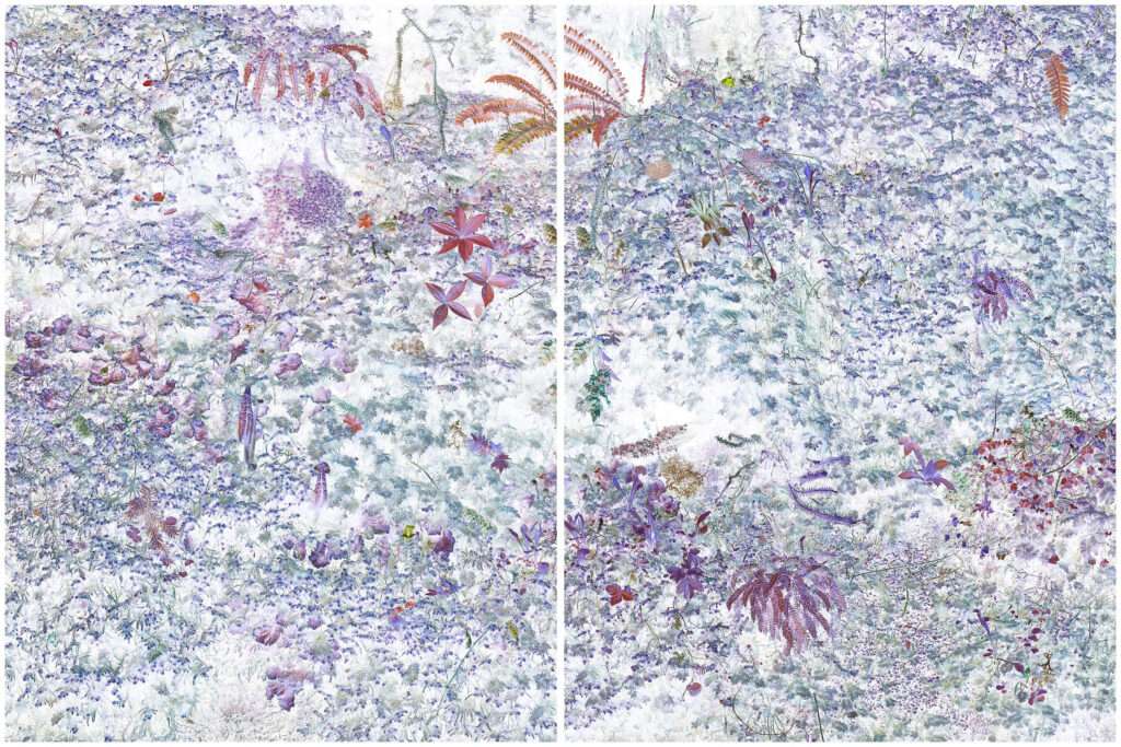 Le parcours se prolonge avec le travail de l’artiste hongrois Tamás Dezsö, qui présente quatre grands diptyques installés dans l’écrin des galeries hautes du château. Son regard singulier, profondément poétique, propose une nature recomposée par la juxtaposition de fleurs, de feuilles, de brindilles et d’éléments organiques variés. Deux de ces œuvres se distinguent par une dominante mauve et violette, conférant à l’ensemble une atmosphère à la fois énigmatique et fascinante. Photographe, mais aussi philosophe et grand lecteur, Tamás Dezsö développe une œuvre nourrie de références intellectuelles et sensibles.