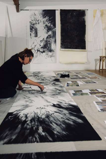 LD. Il se trouve que je connaissais Stéphanie Mansy, artiste installée à Beauvais que j’avais rencontrée lorsque j’étais directrice du Musée de Picardie à Amiens. Son travail autour de la mémoire des murs et du papier comme trace et support m’avait interpellée. C’est une artiste que les lieux en transformation intéressent, interpellent, émeuvent et inspirent. Je trouvais intéressant de transposer cette démarche dans le cloître. Elle a mené des recherches autour des colonnes mais s’est également rendue à proximité des carrières de provenance de ces colonnes dans les Pyrénées : elle a dessiné sur ce temps de résidence et collecté de la poussière dans la carrière de Saint-Béat pour imaginer cette grande composition en noir et blanc : elle a créé des œuvres d’après des croquis réalisés in situ, qui ont été agrandies au moment de leur impression sur bâches. Comme un épiderme qui réagit aux évolutions du lieu.