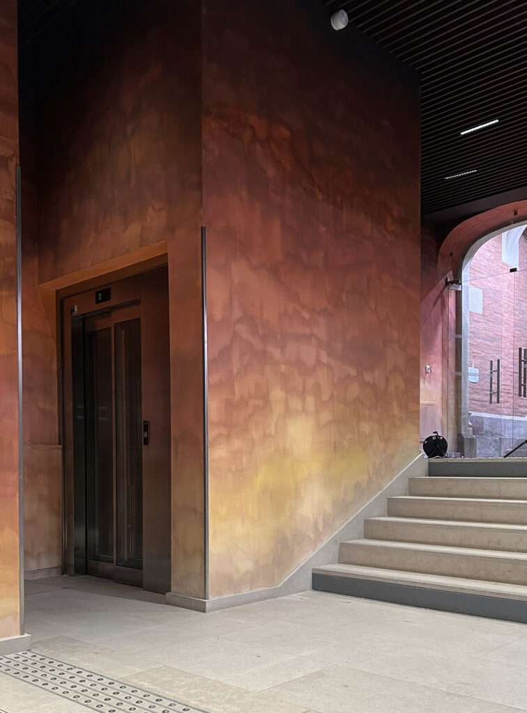 LD. J’ai déjà identifié certains espaces manquant d’identité et j’ai très vite pensé que c’était la création contemporaine qui pouvait s’emparer de ces interstices un peu oubliés. J’ai d’abord rédigé un dossier d’intention qui présentait le musée des Augustins, ses enjeux et pourquoi l’art contemporain. Avec un petit groupe, nous avons commencé à réfléchir et à identifier des lieux potentiels comme ce hall des ascenseurs où la démarche de Flora Moscovici est assez vite apparue dans nos recherches. Nous avons ensuite contacté les artistes tout en restant assez ouverts pour ne pas les enfermer. Flora a répondu rapidement et très favorablement. C’est une artiste qui ne craint pas les espaces un peu complexes. « Des briques et des pastèques » est une œuvre immersive créée pour le musée des Augustins, pour ce sas de circulation entre lumière et obscurité. Elle a créé tout un nuancier de couleurs selon sa démarche, pensé à partir des matériaux environnants : la brique, la pierre, le vitrail, le bois. Le titre est emprunté à un roman post-apocalyptique de Richard Brautigan.
