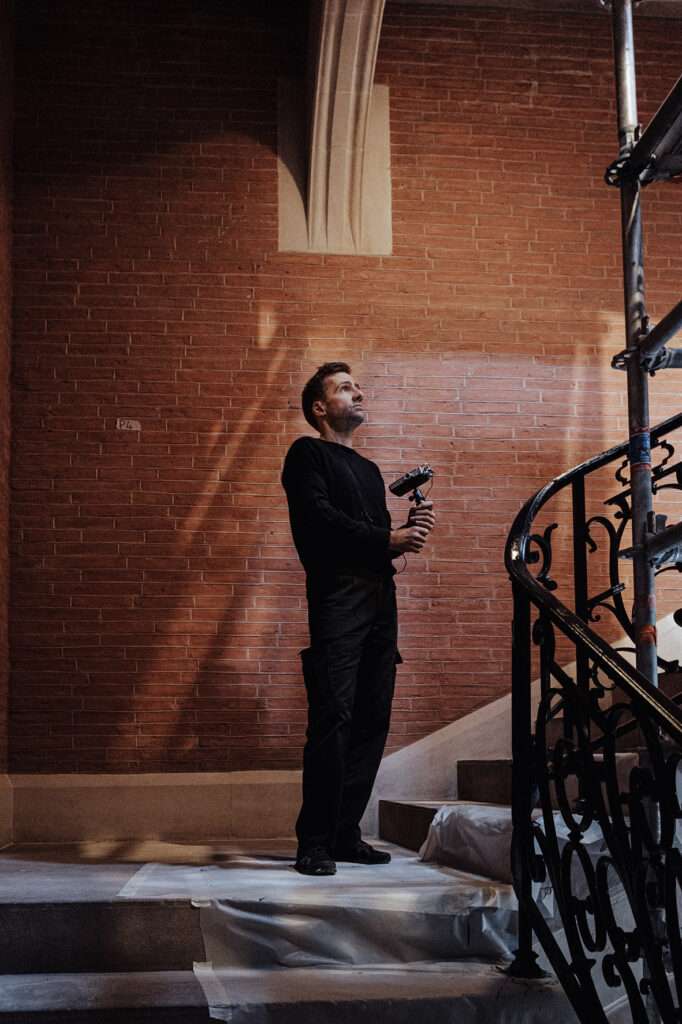 L’artiste Pablo Valbuena réalise un enregistrement dans l’escalier Viollet-le-Duc, Mairie de Toulouse, musée des Augustins photo Sébastien Vaissière